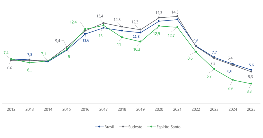 A elevada demanda por trabalhadores em um contexto de relativa escassez de mão de obra, pode ter exercido pressão sobre os salários, contribuindo para sua elevação. Na média anual de 2025, o rendimento médio real mensal habitualmente recebido em todos os trabalhos foi de R$ 3.497 no Espírito Santo e de R$ 3.560 no Brasil, ambos superiores aos valores observados no ano anterior, com altas de 4% e 5,7%, respectivamente. No caso capixaba, esse foi o quarto ano consecutivo de crescimento real.